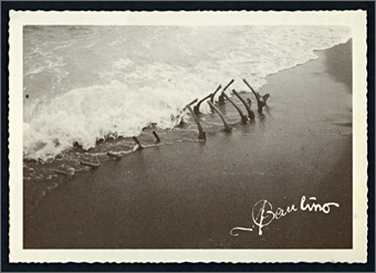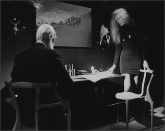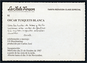 "Con motivo de la presentación de la primera edición de la Silla Gaulino montamos esta interesante exposición. Para la misma construimos un esqueleto gigante de antediluviano animal marino formado con piezas de la misma silla y lo colgamos del techo. El día de la inauguración en el escaparate de la tienda montamos una mesa de arquitecto sobre la que colocamos dibujos y maquetas de la silla. Frente a la mesa, en unas Gaulino, se sentaban Antoni Gaudí (prestado por el Museo de Cera de Barcelona) y una joven modelo en homenaje a Carlo Mollino."