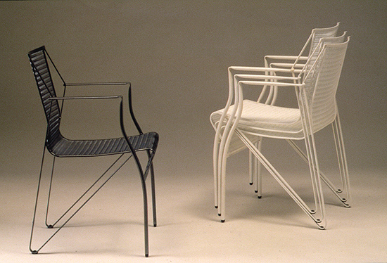Tras la Varius y la Gaulino, en 1987 OTB afrontó más humildemente el diseño de una silla totalmente metálica, apta para exteriores, y lo quiso hacer para su propia productora, B.D. La estructura es de tubo y pletina de acero que, con un repertorio de diversas entregas, acomoda el asiento y el respaldo de deployé y permite ingeniosamente que sea apilable. Un diseño heredero en parte del banco Catalano y que introduce la pata trasera triangulada, que será seña de identidad del autor.