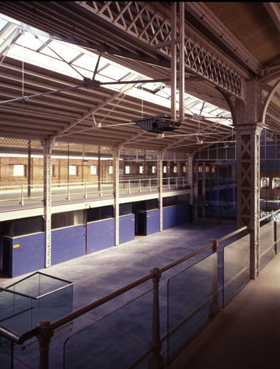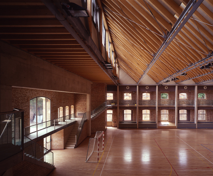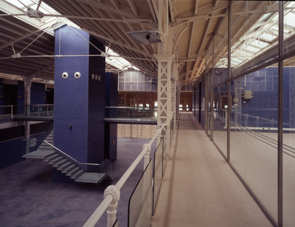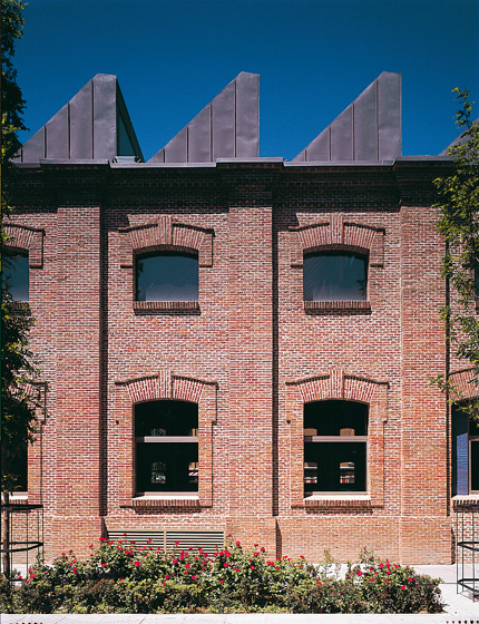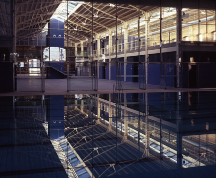 “Evoca” era el lema bajo el que nos presentamos al concurso. Cuando los usuarios del centro acuden allí, no penetraran solamente en un complejo técnicamente moderno; “evocan” el viejo tinglado construido para usos ferroviarios y utilizado más tarde como cuartel del ejército. El histórico edificio ha encontrado un nuevo uso más lúdico, pero tras la remodelación recuerda lo que había sido. No sólo conservamos las fachadas, sino parte importante de la interesante estructura férrea de tres naves. Al repicar el enlucido interior de los muros propusimos dejar estos paramentos desnudos, dejando el ladrillo visto. El resultado es aún más espectacular de lo previsto; no nos bañamos en unas asépticas piscinas de competición..., lo hacemos en unas termas romanas.
