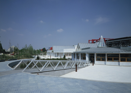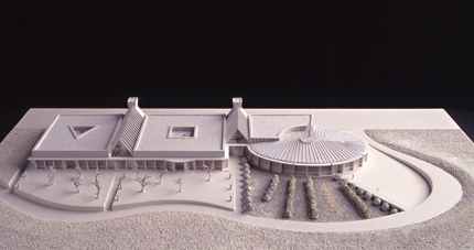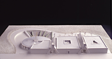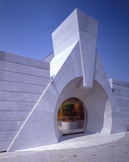 "Una de las “follies composées” que Bernard Tshumi había previsto en su parque, en las que se entablaba el diálogo entre la arquitectura –roja, cúbica y metálica- de Bernard y la del arquitecto invitado. Las bases del concurso aclaraban que se pretendía una integración por contraste, prohibiendo igualar alturas o colores rojizos. Propuse una intervención serena, ortogonal, de un solo material y monocroma. En el exterior aparece solamente el albino mármol y el grisáceo zinc. Tres volúmenes cerrados, conectados por dos invernaderos intermedios que permiten el paso a través para conectar con los jardines del poniente. La geometría de las puertas monumentales y de la planta, remite voluntariamente a Boullée o a Ledoux. La obra, hoy, está totalmente desfigurada."