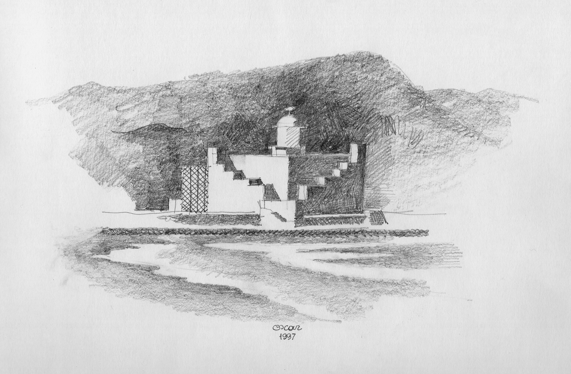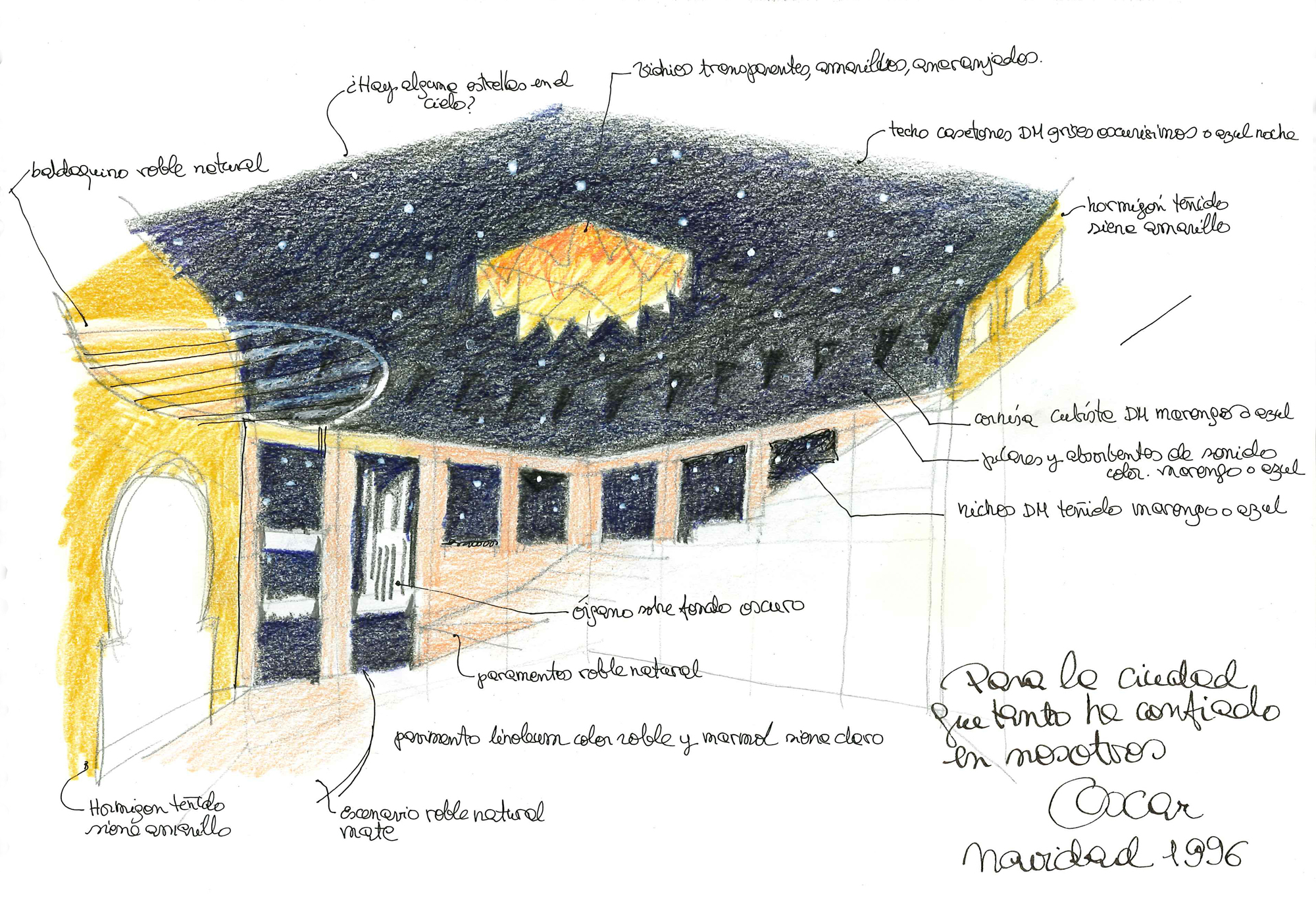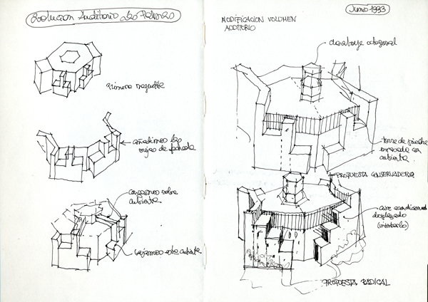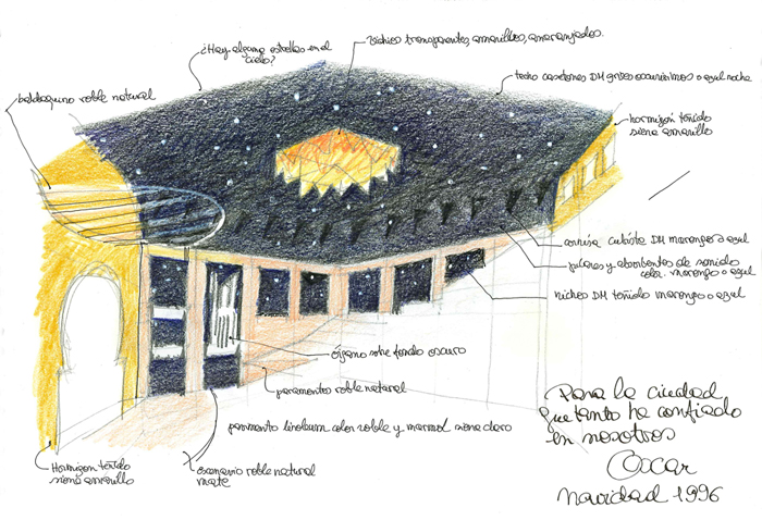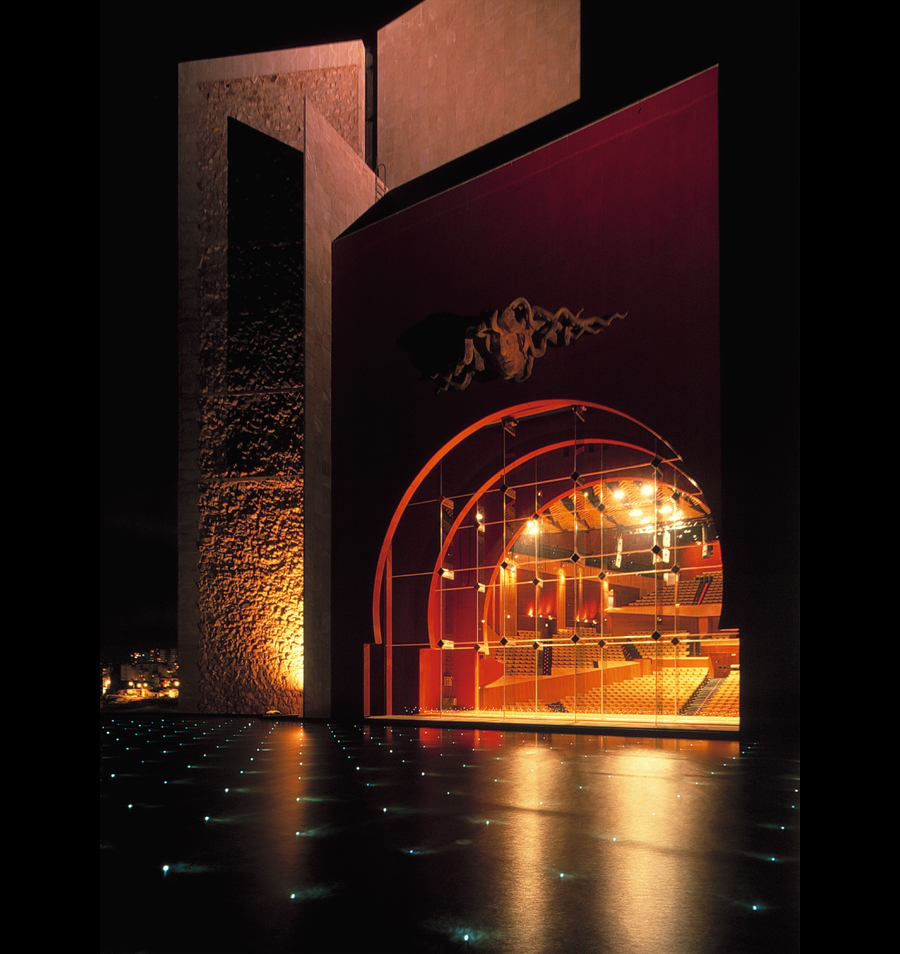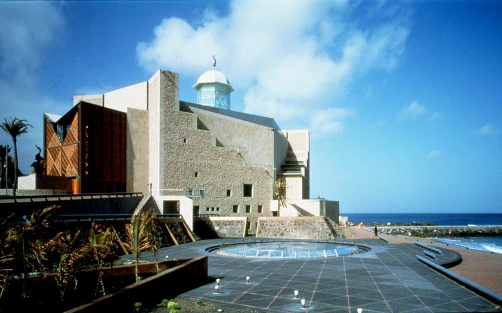 Proyectar a favor del lugar, extrayendo del mismo ventajas para la obra. Por su excepcional ubicación respecto a la ciudad, al mar y a las montañas que le sirven de fondo, el edificio se individualiza, se convierte en un hito monumental que remata dignamente la larguísima playa de Las Canteras adoptando un aire entre fortaleza que la protege y faro que la orienta. La visión del Atlántico se disfruta desde casi todas las áreas, y de manera espectacular desde la sala principal a través un gran ventanal situado tras el escenario. El excepcional clima de la isla posibilita una arquitectura donde sólo las salas de concierto han precisado acondicionamiento térmico.