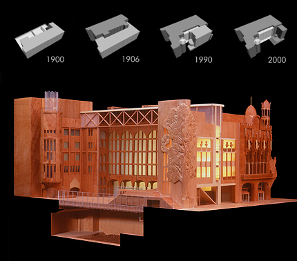 "Diez años más tarde de la primera intervención se consiguió el traslado total de la iglesia vecina lo que posibilitó nuestra aportación más trascendental al monumento: otorgar una nueva fachada al Palau abriendo totalmente a la nueva plaza el riquísimo patio lateral de Domènech.