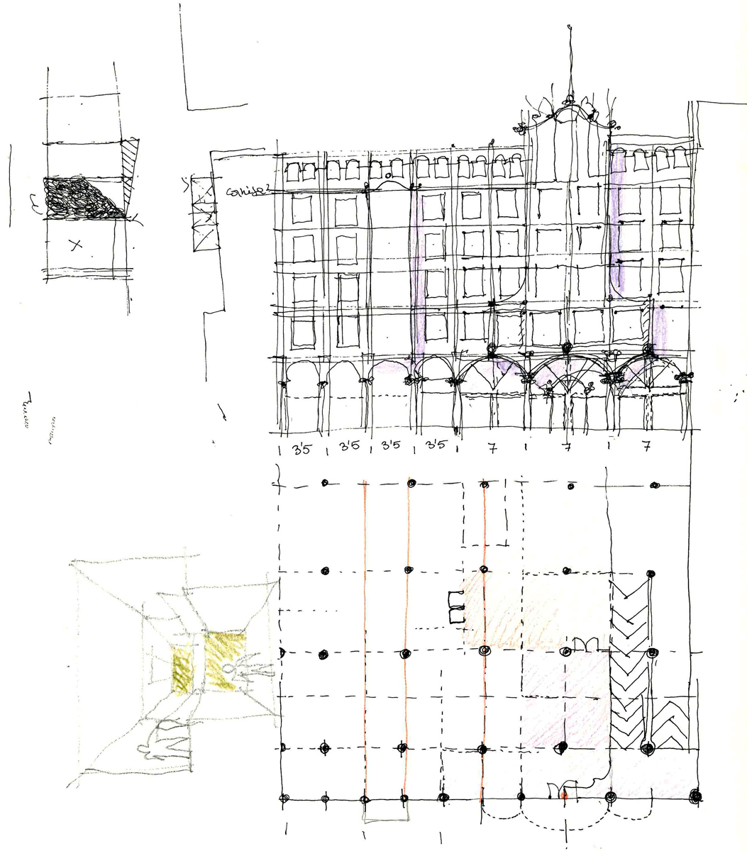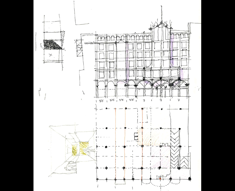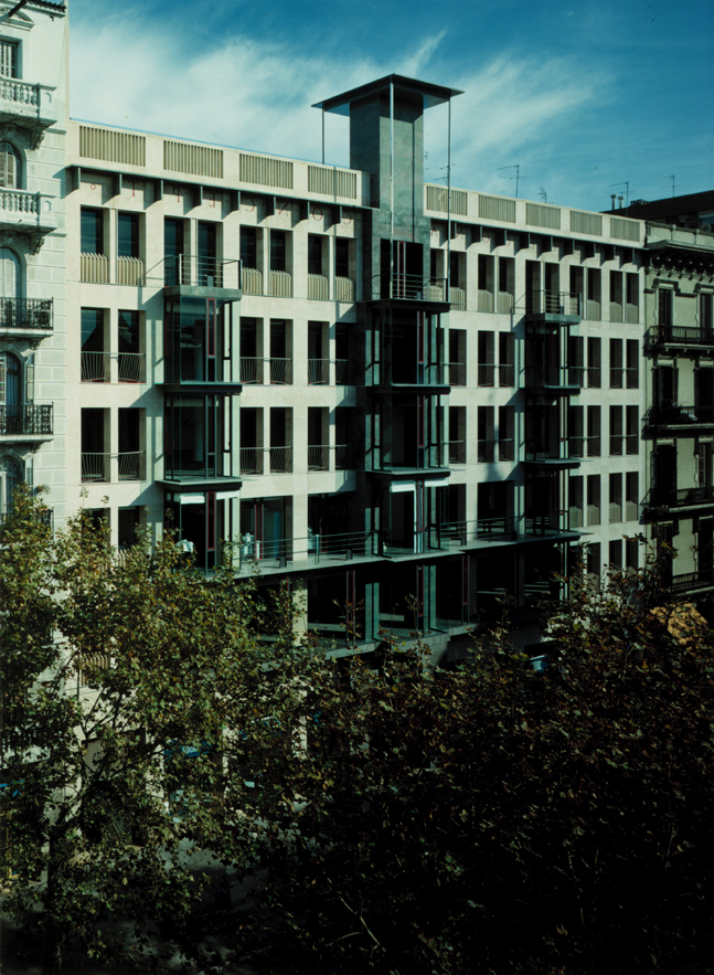 Edificio de oficinas, locales comerciales y aparcamiento, situado en Barcelona frente al mercado de la Concepció. El reto era lograr una fachada digna, que respetase las estrictas ordenazas del Eixample de Barcelona y que se ubicase con el máximo respeto entre las edificaciones vecinas. La composición de la fachada es reflejo de la del valorable mercado modernista que le da frente. La entrada pricipal, enfatizada por un torreón, se situa justo frente a la del mercado.