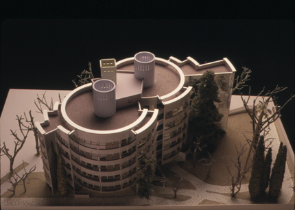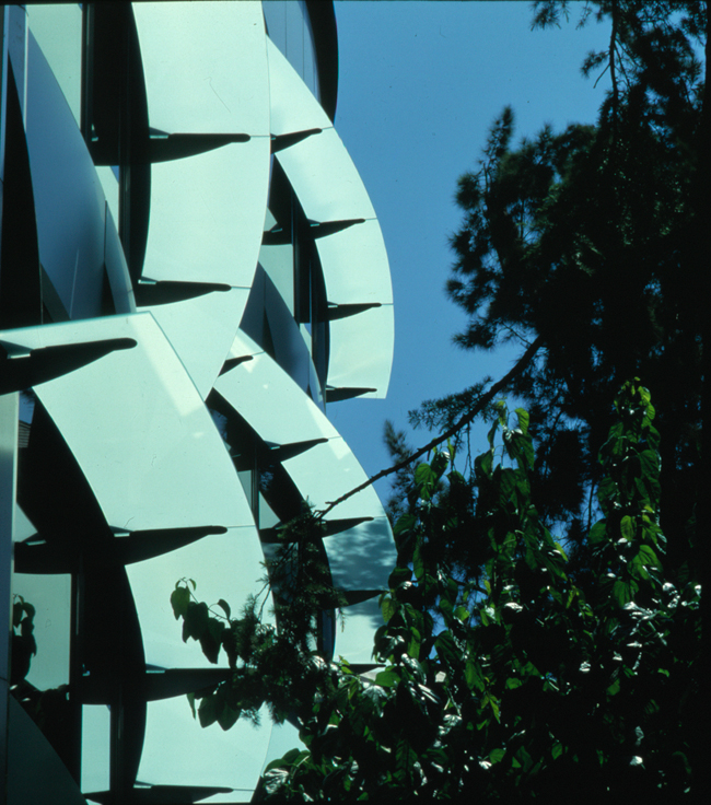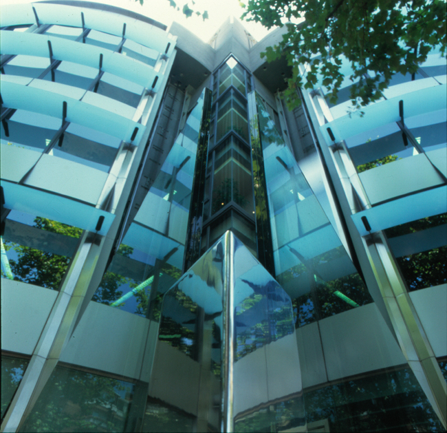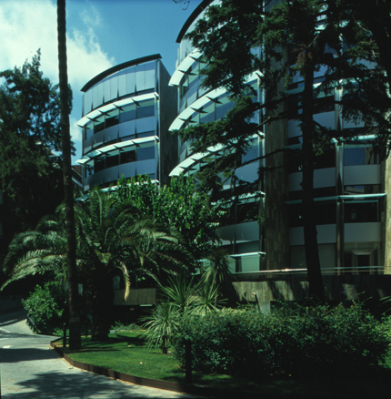 "En el terreno que ocupaban dos villas, una de las cuales albergaba el mítico restaurante Azulete, se proyectó este edificio de oficinas. El volumen de dos cilindros maclados permitía unas plantas totalmente diáfanas y, a la vez, conservar unos árboles de gran porte del antiguo jardín así como la estructura del invernadero que albergaba el comedor -y había merecido el premio Fad- convertida en umbráculo. La decisión de derribar este templete tomada unilateralmente por el promotor significó el cese de nuestra colaboración con Núñez y Navarro."