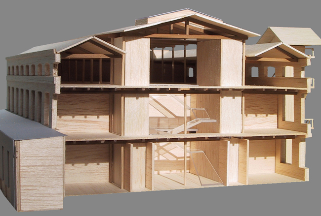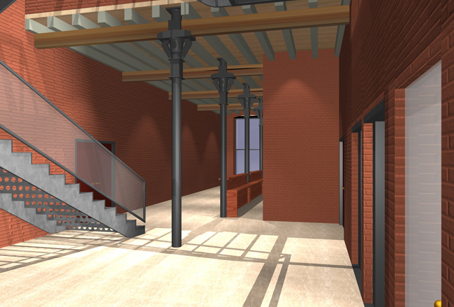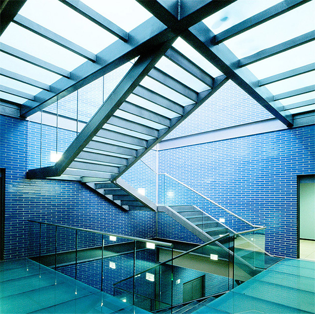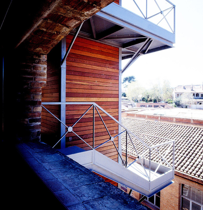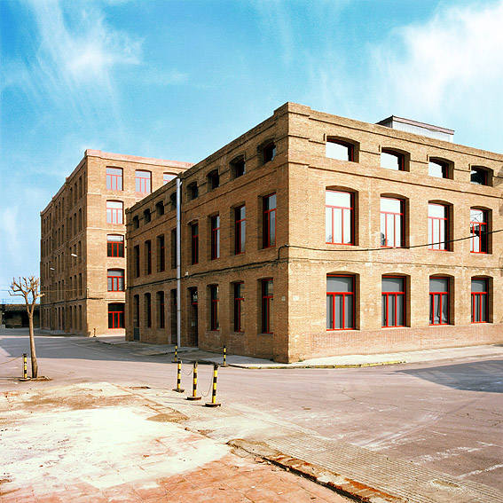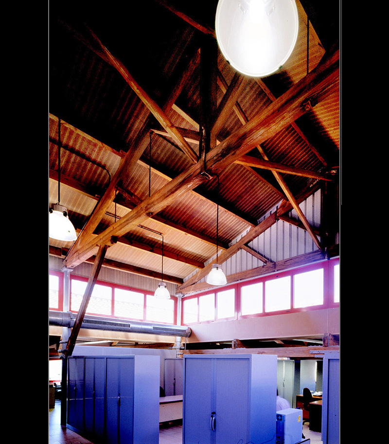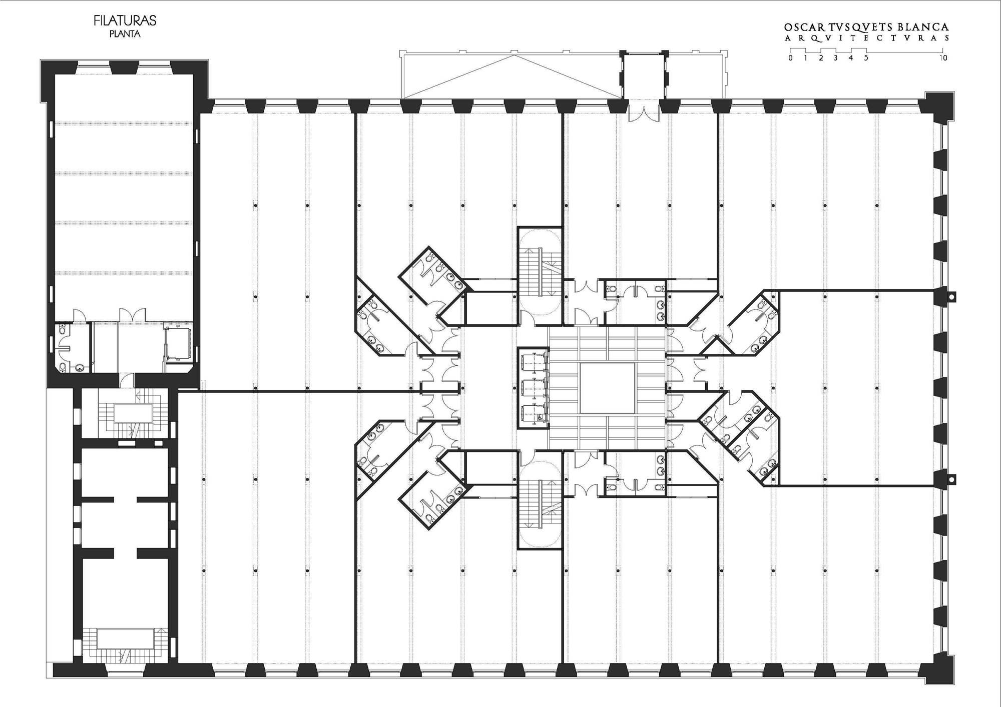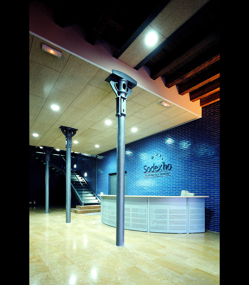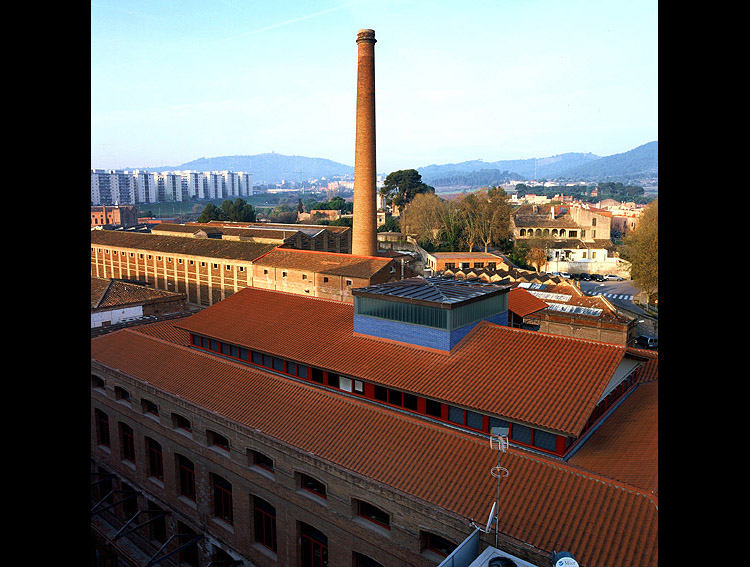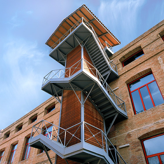 "El valor patrimonial de la Colonia Güell es indiscutible y la pareja de edificios que nos ocupan son los mejores del conjunto. El volumen de la fábrica, la correcta proporción de los huecos y la repetición ordenada de los mismos otorgan al conjunto una dignidad que convenía respetar. Por este motivo se procedió a la restauración completa de las fachadas. Para los nuevos servicios: escaleras, ascensores, aseos... diseñamos un nuevo edificio situado en el centro de cada uno de los antiguos, un edificio contemporáneo, tecnológico y totalmente incombustible de carácter contrapuesto al antiguo, por este motivo las escaleras son de acero y vidrio y los muros de cerramiento de ladrillo vidriado de color azul brillante."