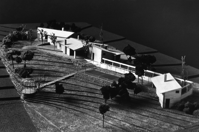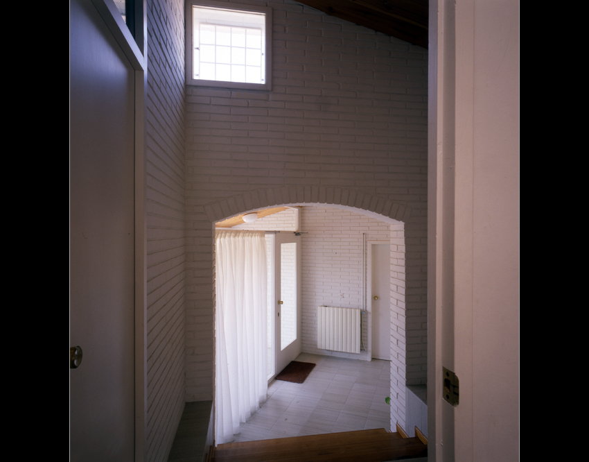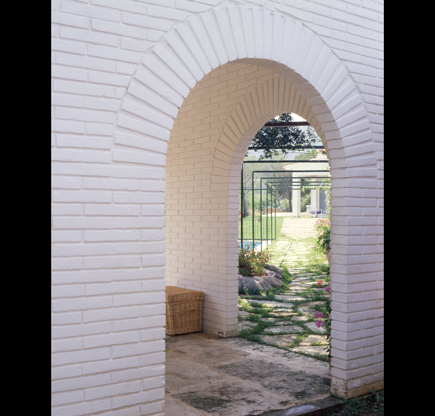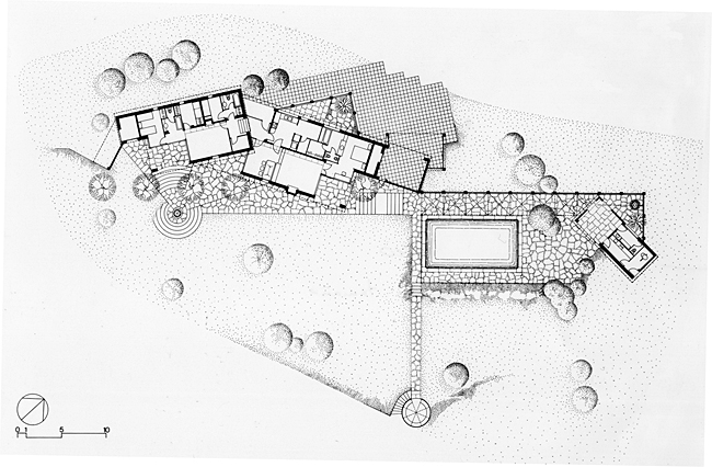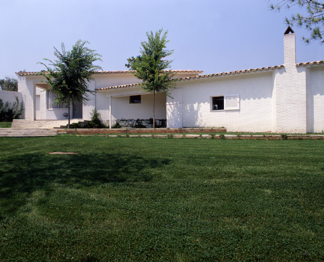 Urbanización planteada con casas aisladas apoyadas sobre la prolongación del césped del campo que se extiende sin vallas divisorias entre solares. Obtener un mínimo de intimidad era fundamental. Por este motivo, la casa, el garaje, la piscina y el anexo se articulan en diversos rectángulos que con sus giros protegen del viento y de las vistas desde calle. Mientras las dependencias principales miran a mediodía y al campo de golf, las de servicio miran a Norte y a la calle. En un punto de fuga, al fondo del jardín privado, una glorieta se cubre de glicinias en primavera.