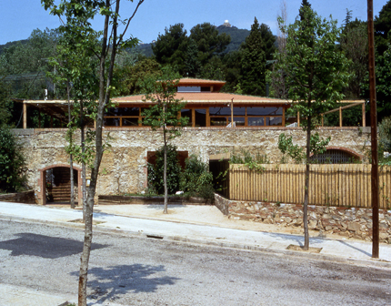 "En el centro del solar se encontraba una alberca del siglo XIX de piedra y ladrillo. Introdujimos el conjunto de la edificación en su interior y dedicamos el resto a jardín. En la planta semisótano, aparte de los servicios del restaurante, situamos el apartamento del propietario. Esta vivienda se desarrolla alrededor de un patio y dispone de un jardín privado e independiente.