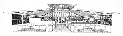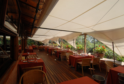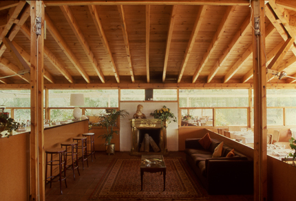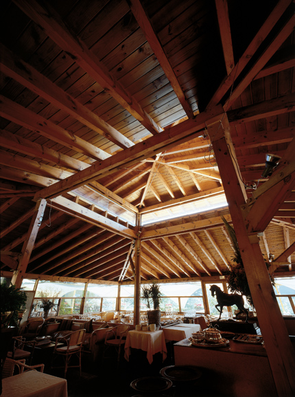 En la planta superior, tras el pretil de la alberca, aparece un chiringuito en madera que alberga el comedor cerrado. Al frente dispusimos una terraza de invierno al mediodía (que más tarde hemos protegido como comedor de fumadores); detrás, una de verano a la sombra de un emparrado."