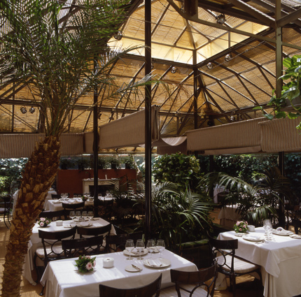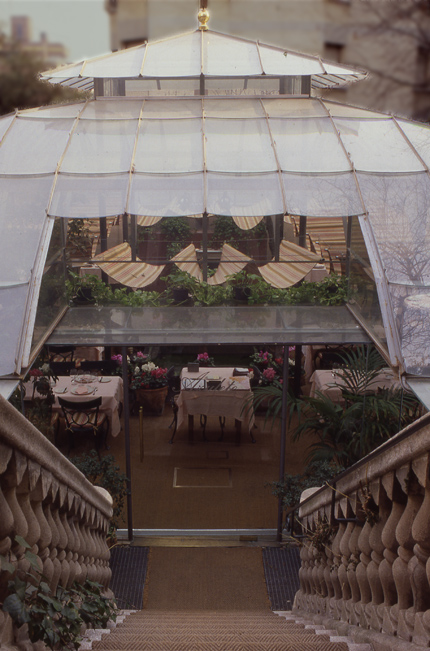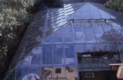 "Un bello chalet modernista en la parte alta de la ciudad. En su jardín, bajo los árboles, comía la gente durante el verano. La decisión clave fue desaconsejar la alteración del interior del chalet para ubicar el comedor. Recomendamos dejar las mesas donde estaban y cubrirlas con un paraguas de cristal. En el interior del chalet, respetando las habitaciones de la antigua vivienda, se ubicó el bar y un comedor privado. Siempre se decoraron paredes como jardines y techos como firmamentos. En este comedor-invernadero conseguimos árboles vivos en las paredes, y en el techo... un cielo real. Azulete fue derribado en contra de la decidida opinión del arquitecto; una réplica se ha construido en el Hotel Miramar."