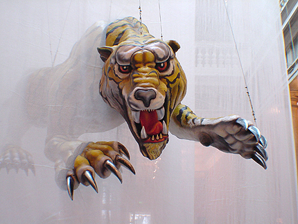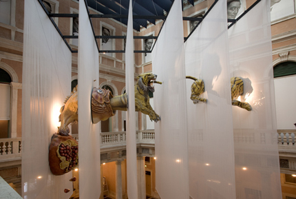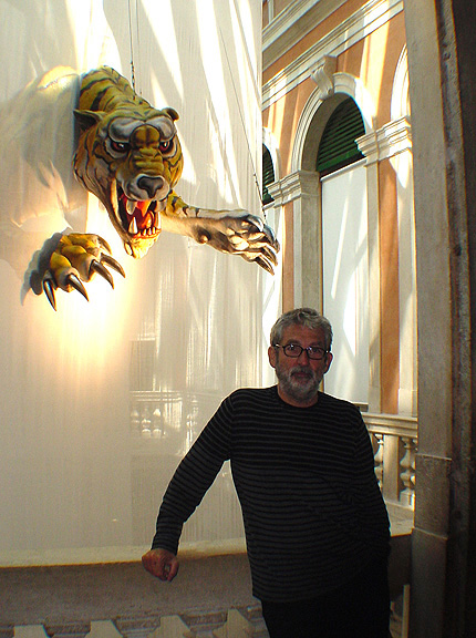 Por diversos motivos no nos podíamos apoyar en el pavimento del cortile, nuestra escultura debía estar suspendida en el aire, y ¿qué más daliniano que hacer volar una enorme granada, un boquiabierto pez y dos fierísimos tigres por encima de los indefensos visitantes?"