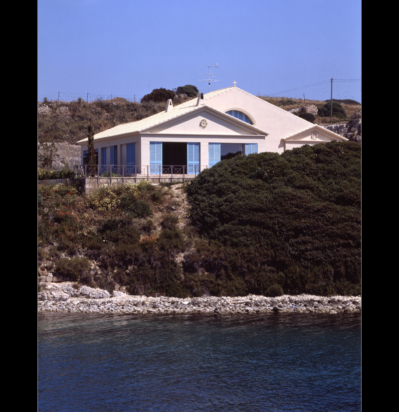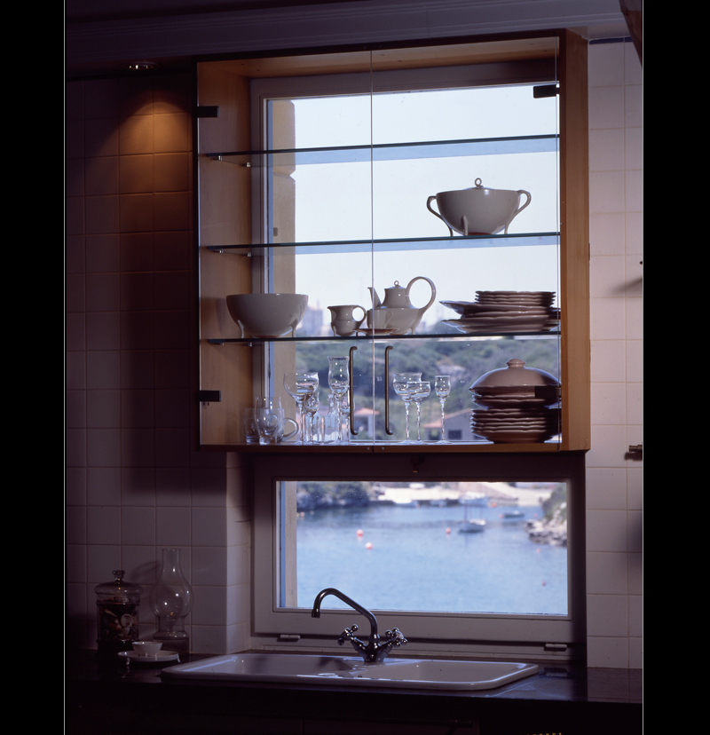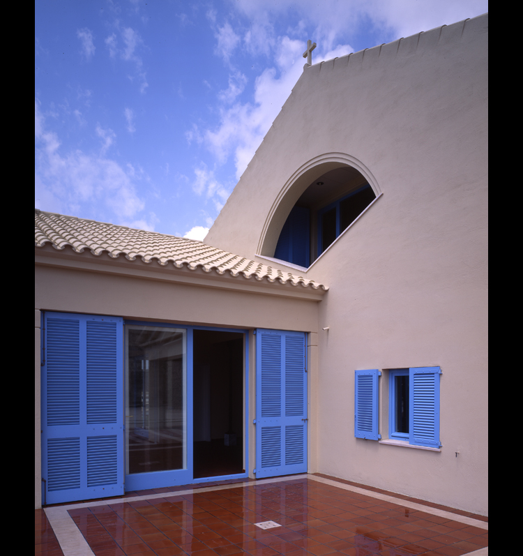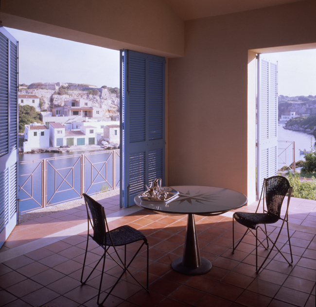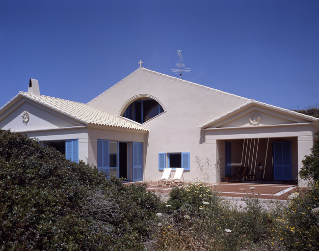 Arquitectura mediterránea colgada sobre una cala menorquina. Arquitectura de ventanas pequeñas donde los grandes ventanales se protegen siempre por profundos porches. La amplia cubierta a dos aguas protege toda la construcción. Las tejas árabes pintadas en tono muy claro como es tradición en la isla.