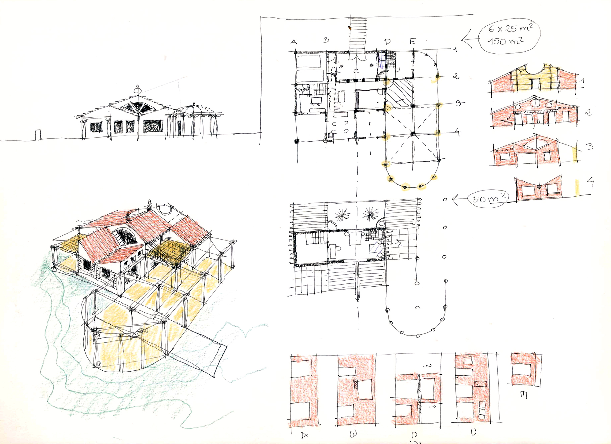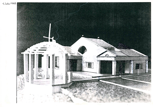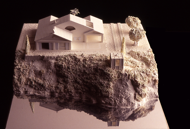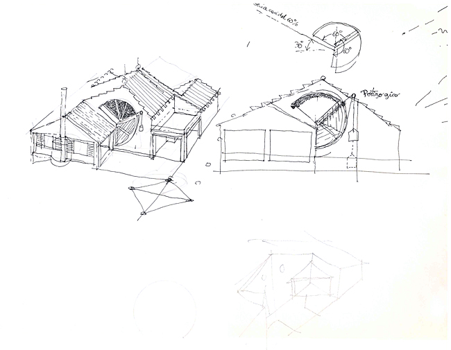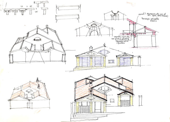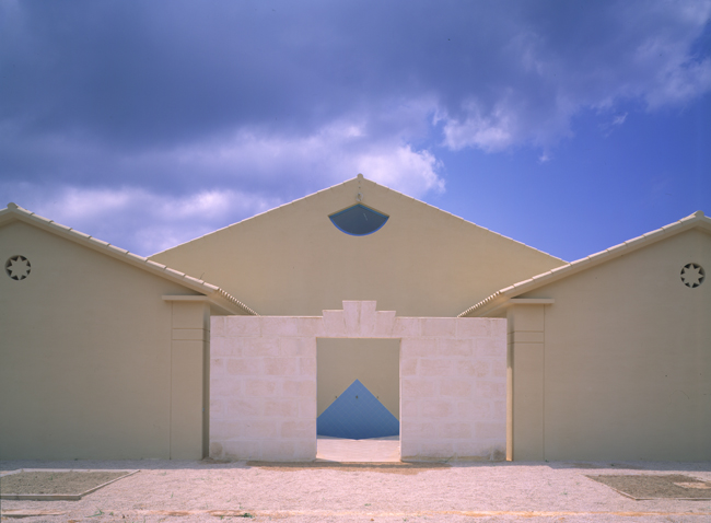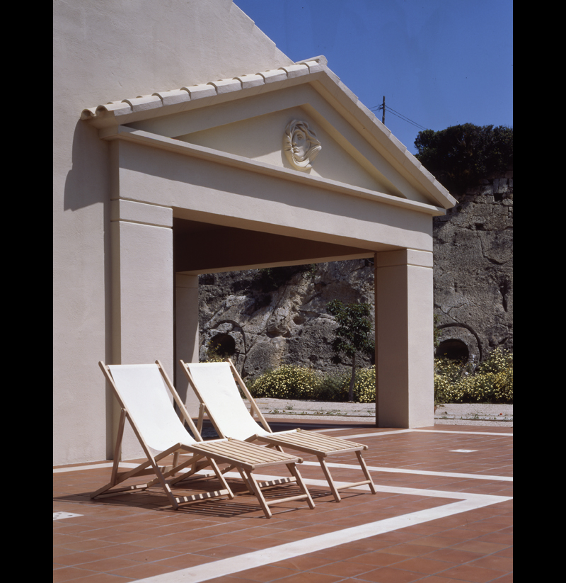 Referencia-homenaje a la ingenua arquitectura neoclásica presente en casitas populares y en blancos cementerios. Un íntimo patio de acceso tras el portalón abierto en un muro de piedra del lugar.