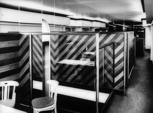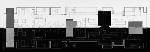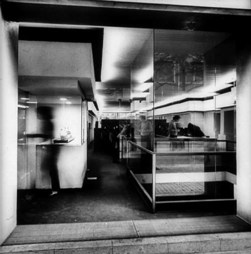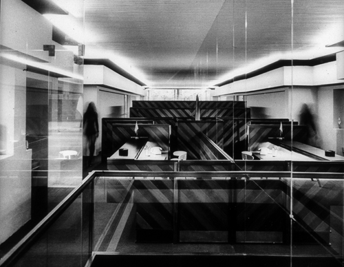 "Un espacio con muy poca fachada, largo y estrecho en planta baja y sótano. Un recurso de la arquitectura vulgar: colocar un espejo en una de las paredes para doblar el espacio visual en anchura (en este caso el espejo baja a la planta sótano aprovechando las aberturas del forjado de la planta baja y ayuda a la comunicación visual entre ambos niveles).