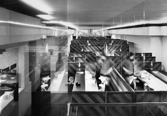 El intento de llevar hasta el límite esta imagen, diseñando el mueble alberga todos los lugares de trabajo como la mitad de un mueble central simétrico.