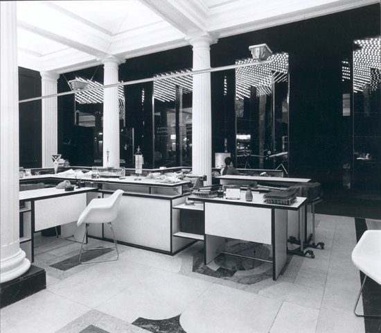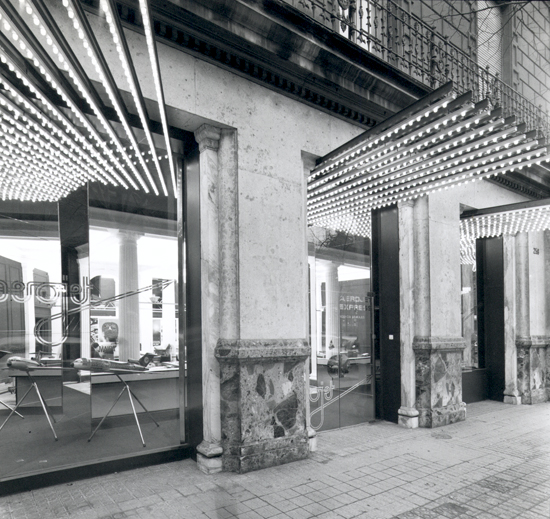 Esta agencia, ubicada en un edificio neoclásico, pretendía, inspirándose en los efectos luminosos de la calle 42 de Nueva York, jugar visualmente con los clientes, respetando la caja envolvente. Unos haces lumínicos, dispuestos linealmente, proyectaban la luz desde el interior hacia la calle gracias a un sistema de encendido programado que sugería su movimiento. En el interior, el juego de reflejos en grandes espejos y las sombras pintadas acababan de conformar un espacio expresionista e intimista a la vez. Esta agencia ya no existe en la actualidad.