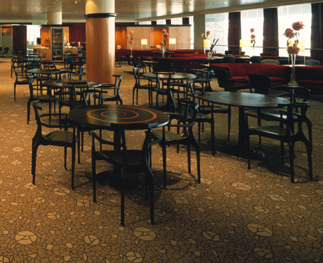 Así, todo el mobiliario es diseño de OTB, incluso el motivo de la moqueta, producida por Vorwerk. La sala se divide en diversas zonas que, sin llegar a estar cerradas, ofrecen diversos grados de intimidad según el uso; hay zona de televisión, mesas altas, mesas bajas con sofás, muebles bar, zonas de intercomunicación, y módulos de trabajo personal con ordenador donde poder conectarse.