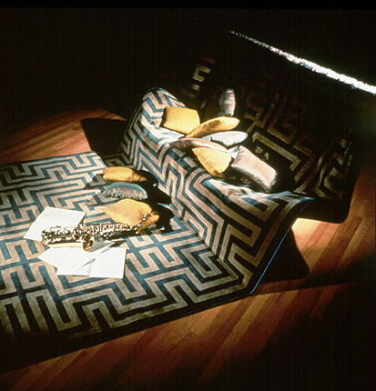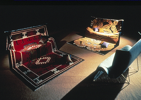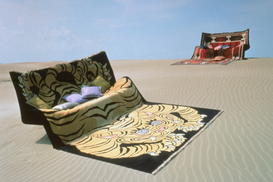 La magia de sentarnos en el suelo. Una alfombra de lana que se eleva y se moldea hasta adoptar la forma de un asiento con su respaldo. El diseño surge de la observación de un acto muy común al ver la televisión o charlar informalmente: sentarse en el suelo sobre una alfombra apoyando la espalda en un sofá.