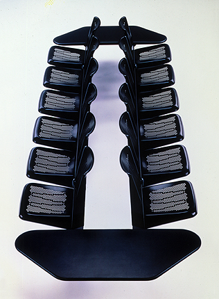 La propuesta de OTB pretendía innovar en el sistema portante y ofrecer un producto confortable y robusto. Para ello integró el elemento horizontal de soporte como un componente más del conjunto, calculando su carga resistente en combinación con el resto y girado para recibir correctamente asiento y respaldo. Éstos se conforman, a su vez, con una estampación que le otorga volumen y resistencia, además de ergonomía. El troquelado de la chapa aligera el volumen general y ya puestos se aprovecha para otorgarle una sutil decoración.