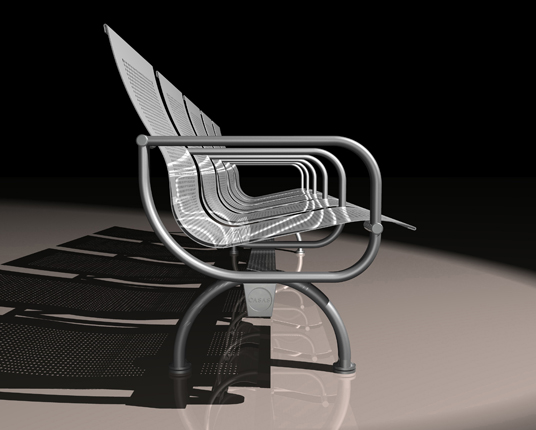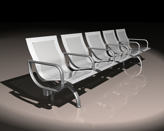 Los asientos son planchas convenientemente dobladas para dar confort y pueden ser tapizadas, en su versión más lujosa, o de plancha perforada previendo su uso intensivo en espacios públicos. El conjunto adquiere una gran liviandad, respetando el entorno donde se ubica.
