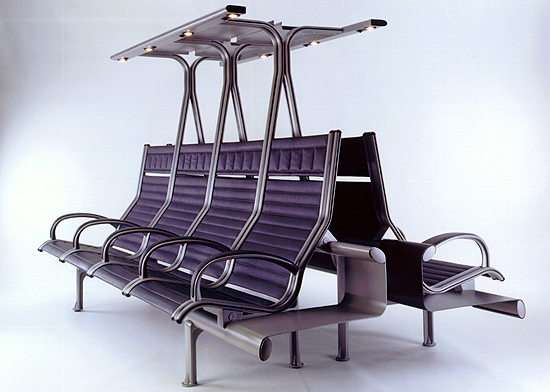 Existe un modelo donde los perfiles crecen hacia arriba conformando un pequeño saliente a modo de techo que sirve de repisa-maletero, permite colocar una iluminación puntual, y además ayuda a crear un espacio recogido, que ofrece cierta intimidad al usuario —muy de agradecer en las largas esperas en lugares que por sus grandes dimensiones y altura resultan generalmente inhóspitos—.
