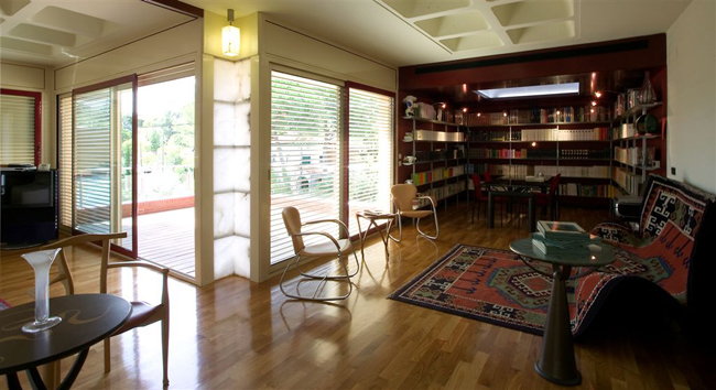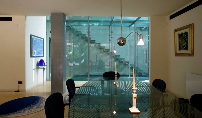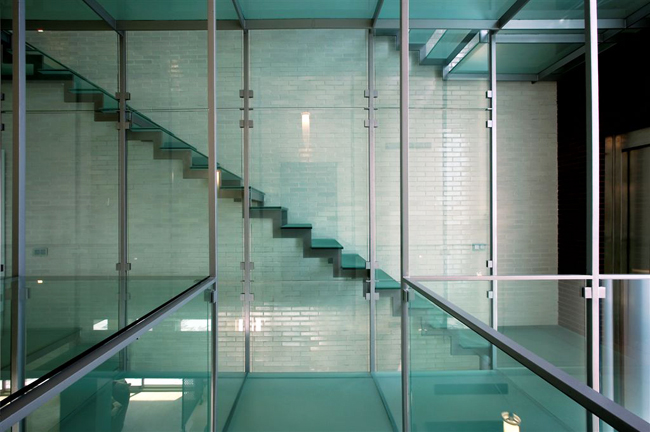 El hueco de la escalera iluminada por claraboyas y con pavimento vidriado es el corazón de la planta subterránea y de las tres plantas sobre el terreno.
