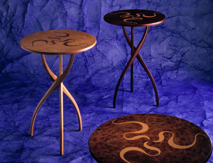Recuperación de una familia de pequeños muebles auxiliares casi en extinción. Los catálogos de las principales empresas de diseño apenas prestan atención a estas tipologías menores. La idea consiste en un rediseño de la típica mesita de tres patas plegables, pero estilizando éstas con una forma sinuosa y ofreciendo un sobre de alta calidad artesanal con motivos ornamentales en marquetería.