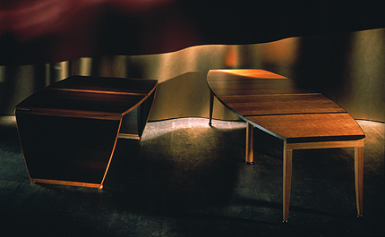Se trataba de conseguir una mesa verdaderamente señorial y fácilmente alargable. OTB resolvió una serie de cuestiones que se había auto impuesto: que la mesa se alargara desde 1,50 a 2,80 metros, que los paneles de extensión se guardaran en la propia mesa, que la superficie se mantuviera siempre plana a igual nivel, que las patas no molestasen a los comensales, que el perfil curvo facilitara la comunicación, y que los mecanismos fueran sencillos y silenciosos. Y todo con una fabricación impecable que resistiera tanto trote. Muchas veces la exigencia del guión facilita la bondad del producto.