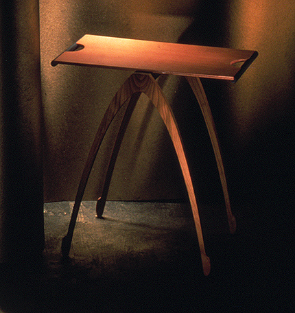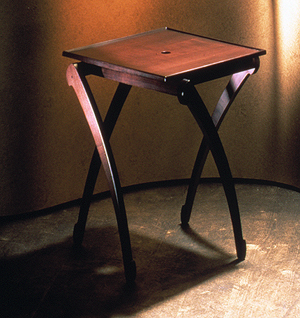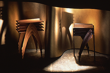 Inspirada en un dibujo de Gaudí, cada pata sale de una esquina y va a parar al pie de la siguiente en el ángulo contiguo. De esta forma se crea un juego visual donde las patas se entrecruzan dinámicamente sin menoscabo de la estabilidad.”