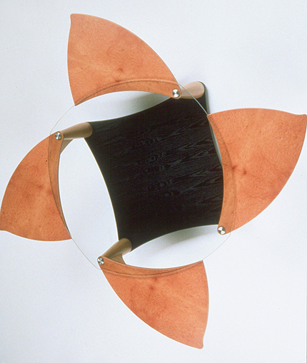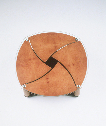 Mesa de centro con mecanismo de bandejas giratorias. La idea era crear una mesa baja de sala de estar ni demasiado pequeña, ni aparatosamente grande, adaptable a los usos variados que se le piden. La mesa dispone de cuatro bandejas bajo el sobre de cristal que, a modo de pétalos, se abren girando sobre las patas para acercarse al usuario; cuando no son necesarias se pliegan bajo el cristal de forma decorativa.