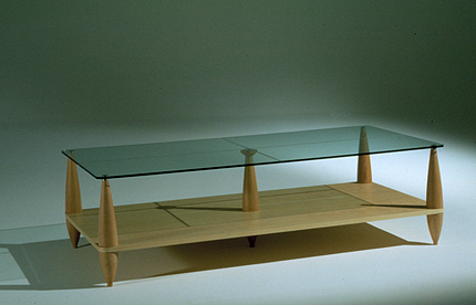 Mesita baja alargada, con una bandeja de madera y un sobre de vidrio sustentado por patas en los cuatro extremos, además de una pata central que da apoyo al vidrio justo en su centro.