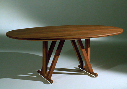 Una gran superficie ovalada de madera maciza necesita unas potentes patas que aseguren el equilibrio. Las patas inclinadas amplían la estabilidad y las verticales dan consistencia y rigidizan el conjunto al triangularlo. Todo resuelto con un único material, madera maciza cuidadosamente tratada.