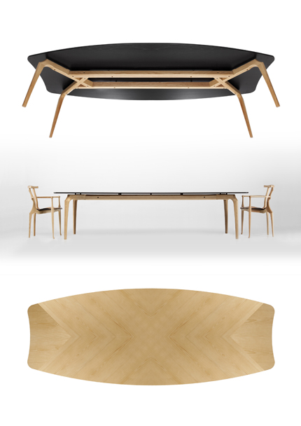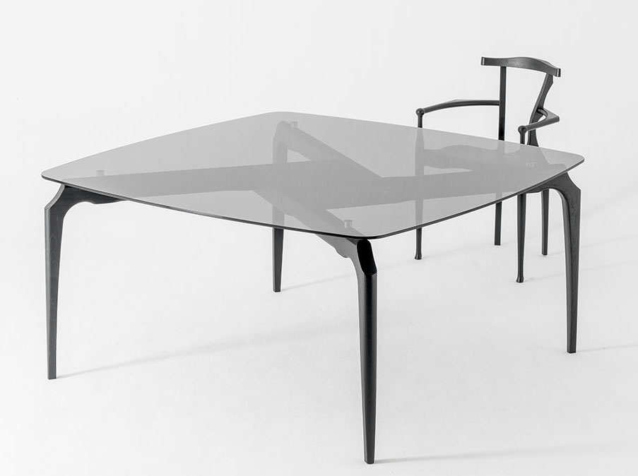 “Más de veinte años después de haber diseñado la silla del mismo nombre he proyectado estas mesas que intentan relacionarse con ella sin ser miméticas. El sobre puede ser de madera chapada o de vidrio (con lo que el homenaje a Carlo Mollino se hace aún más evidente).”
