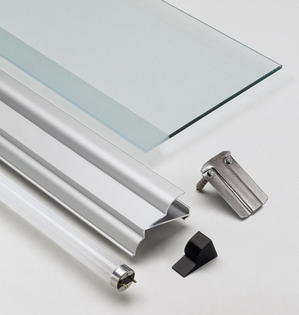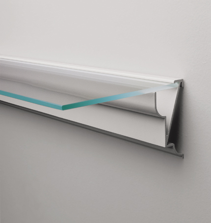 Adjetivo que significa similar al vidrio. La idea primigenia consistía en enganchar un vidrio directamente al yeso de la pared para ofrecer un plano sutil de apoyo. El reto era crear una estantería alternativa a las habituales de grosores desmesurados y aspecto burdo. Para ello se pensó en un extrusionado de aluminio que adoptase la silueta de una cornisa, donde se pudiera encajar un vidrio volado que soportara los objetos. Dentro del perfil se puede, opcionalmente, incorporar un tubo fluorescente que proyecta la luz hacia arriba y se transmite a través del cristal hasta su borde.