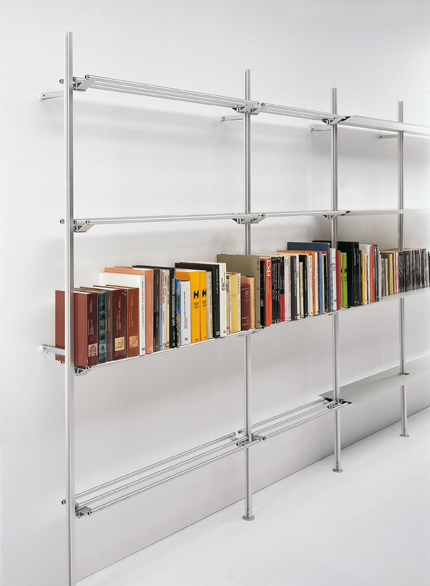 Nacida como alternativa de mayor carga a la estantería Hialina. Esta última, atornillada en la pared como una cornisa, pretendía únicamente ofrecer un apoyo ligero a pequeños objetos domésticos o de baño, pero al ser cargada con abundantes libros, el sistema de fijación al muro —no la estantería en sí— no ofrecía suficiente garantía. Por tanto, se plantea el nuevo reto de crear un sistema de estantes resistente para grandes cargas. La mejor solución era apoyarse directamente en el suelo y no en la pared, de ahí el nombre: hipo, debajo; stylos, columna; la sala cuyo techo está sostenido por columnas. Sobre los montantes verticales se apoya, como en el tablero de un puente, el estante de aluminio, que va disminuyendo canto hacia los laterales donde necesita menor sección portante. Unas sujeciones a la pared impiden que la estantería vuelque, aunque realmente el peso sólo carga en el suelo. Del cálculo de resistencia de los perfiles extrusionados de aluminio se encargó el ingeniero de caminos Jesús Jiménez, colaborador habitual de OTB.