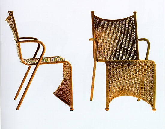 Retomando la técnica de la Fina Filipina, esta silla se conforma como un tejido que se ondula desde el respaldo creando el asiento, y un faldón que sujeta las patas delanteras. La unidad compositiva de la pieza le confiere una gran elegancia, especialmente cuando se recoge para permitir doblar las piernas hacia dentro.