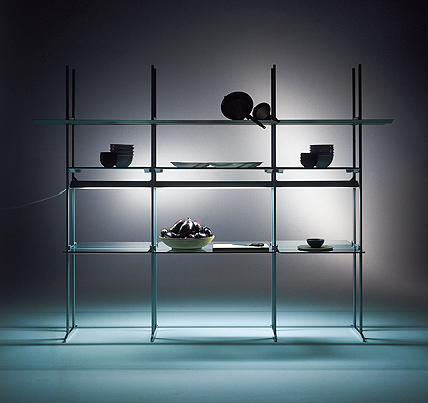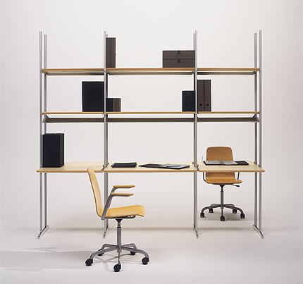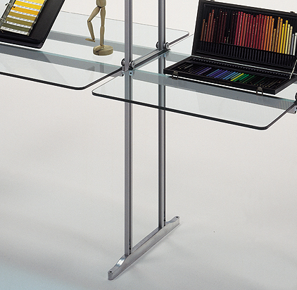 La estantería se independiza totalmente de la pared y del techo. Un pie ancho la convierte en la opción más versátil de las estanterías Hipóstilas.