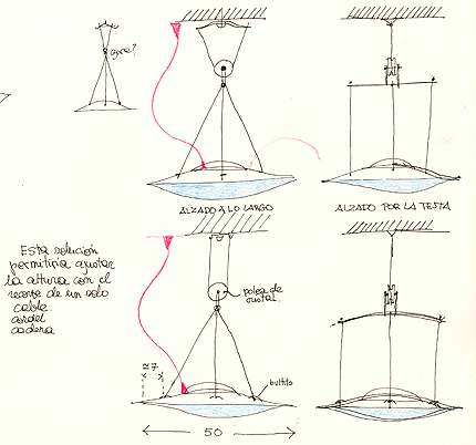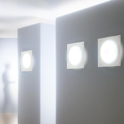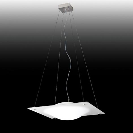 Lámpara colgante de techo (2000) y de pared (2001). Se trata de una nube ondulada de vidrio que flota en el aire. Dos láminas cuadradas que han sufrido un abombamiento en su centro, encaradas, conforman la cavidad que esconde la luminaria. Desde los cuatro extremos, sutiles cables sostienen la lámpara, que puede regularse en altura mediante un contrapeso.