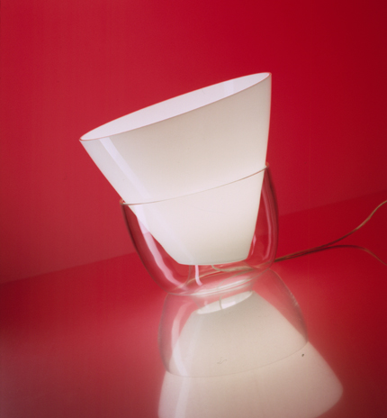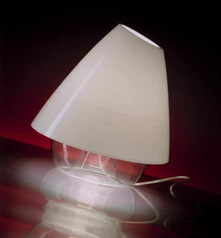 Lámpara de sobremesa. Se trata de una base aproximadamente cilíndrica en vidrio, a la que se superpone otra pieza del mismo material como pantalla; en medio se fija un portalámparas. La pieza superior puede colocarse de diversas maneras girando el apoyo sobre la inferior, dando así un singular efecto de inclinación. Además, cada pieza adquiere tonalidades diversas aprovechando la extraordinaria riqueza cromática del vidrio de Murano.