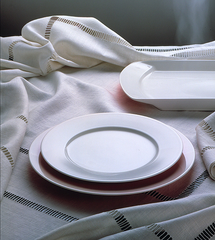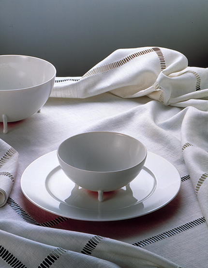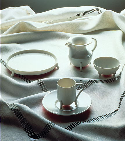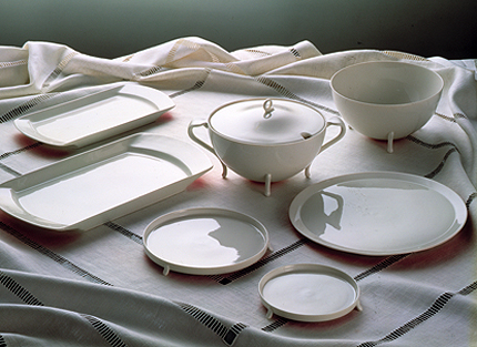 El color rojo se refleja sobre el mantel o el plato inferior, dejando un aura cálida, que acompaña en la comida. De esta forma el lienzo del plato queda blanco, inmaculado, para que sea el chef quien decida la composición del plato sin interferencias gráficas o cromáticas del diseñador. Esta no-decoración del plato fue inspirada por las lámparas de Poulsen, que aprovechaban la reflexión sobre escamas para ocultar el foco emisor de luz. Las tazas, teteras, cuencos, soperas y bandejas se apoyan sobre sutiles patas que levantan elegantemente el contenedor del mantel. La cubertería tampoco pretende revolucionar este tipo de utensilios; las experiencias innovadoras recientes han sido principalmente estéticas, pero en detrimento de la funcionalidad.