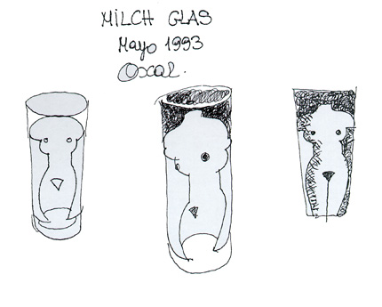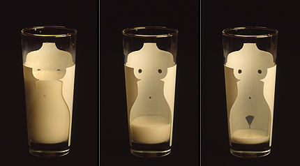 Vaso para la leche, dentro de una colección encargada a diversos autores internacionales. Recrea el efecto de ir desnudando a una mujer a medida que se va bebiendo el contenido. Con el vaso lleno la silueta femenina blanca se confunde con el contenido, pero a medida que se va vaciando, por contraste con el fondo oscuro, emerge la silueta en desnudo integral. Premio seguro para que el niño se tome la leche.