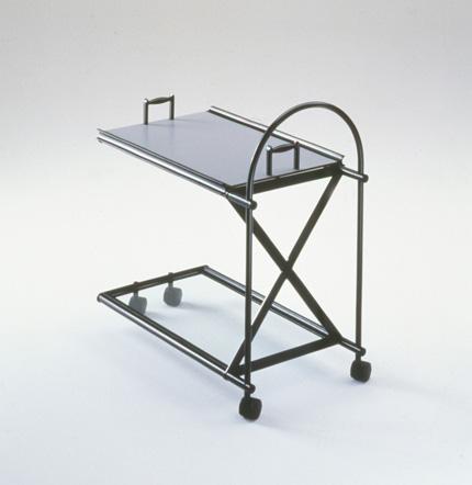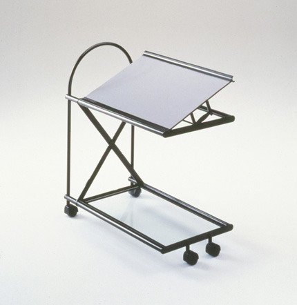 “Intento de llevar al hogar la comodidad de las mesitas que en los hospitales permiten comer en la cama. Dando la vuelta a la bandeja tenemos un atril donde apoyar confortablemente los voluminosos libros de arte (aunque diseñé el carrito antes de la aparición de la Taschen Verlag).”