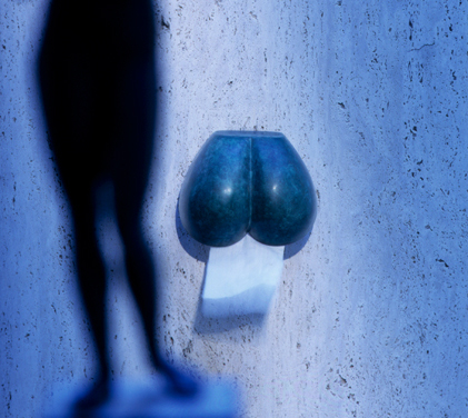 Portarrollos de papel higiénico que adopta la forma de un culo. Literalidad dulcemente evocadora para un lugar que admite pocas bromas como el water. El papel sale de un culo para ir a otro. Este proyecto inicialmente fue pensado para ser fabricado en metal por Alessi.