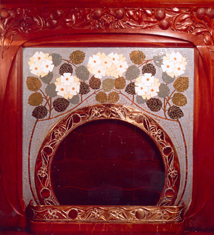 Ironía mitómana burguesa. En realidad se trata de un póster, una reproducción fotográfica a escala real de una chimenea del arquitecto modernista Lluís Domènech i Montaner. Por un módico precio, quien no tuviese acceso a una chimenea de verdad, podía instalarse ésta en su hogar.