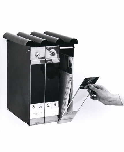 Pero dar mayor capacidad a los buzones, manteniendo la habitual disposición apaisada del bloque, supondría llenar vanos inmensos de pared; por ello surge la idea de situar los buzones ordenados lateralmente, en sardinel, como se colocan los ladrillos, de canto. Un módulo alto, estrecho y profundo que, cual libro en la estantería, pueda conformar un bloque de servicio en el vestíbulo del edificio.