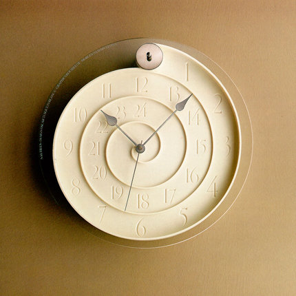 Reloj de pared. El encargo consistía en hacer un reloj de pared, y la ocurrencia fue plasmar el tiempo como algo infinito y asimétrico. La esfera tradicional de sólo 12 horas, la mitad de un día, no deja de ser una restricción convencional para medir el tiempo.