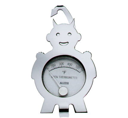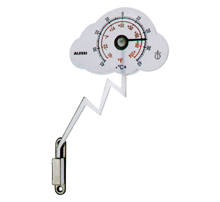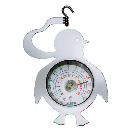 Se trata de un modelo para exterior, otro para horno y un tercero para nevera. Debían tener un aire de familia, pero aspectos y usos diferentes. Obviamente OTB eligió motivos alusivos figurativos para ofrecer su solución. Las formas dibujan respectivamente una nube, un demonio y un pingüino, según se quiera saber la temperatura exterior, los grados del horno, o los del frigorífico.