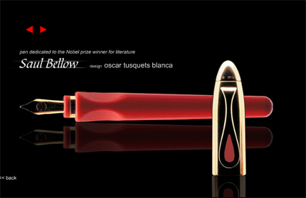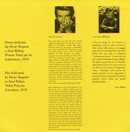 “Una idea típica de Cleto Munari. Cada diseñador debía proyectar una pluma estilográfica dedicada a un Premio Nobel de Literatura. A mí me correspondió Saul Bellow. Mi pluma se ha deformado por la presión de los dedos.”