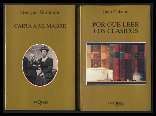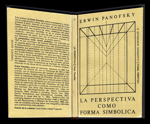 “Textos marginales de afamados autores caracterizados por las cubiertas de cartulina dorada. En La Perspectiva como forma simbólica de Panofsky nos atrevimos a hacer el mismo libro en perspectiva, con la cubierta y contracubierta en esviaje y el ejemplar guillotinado en diagonal, todo ello años antes de la posibilidad de manipulación digital.”