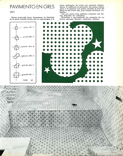 Con una única pieza podemos componer seis formas diferentes de nubes. Girándolas se aprovechan sus asimetrías y aparecen dieciséis nubecitas distintas que cierran o abren el cielo nublado y estrellado. La típica trama ortogonal de juntas de las baldosas desaparece y se conforma un dibujo orgánico que da la impresión de no tener módulo alguno.