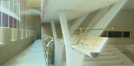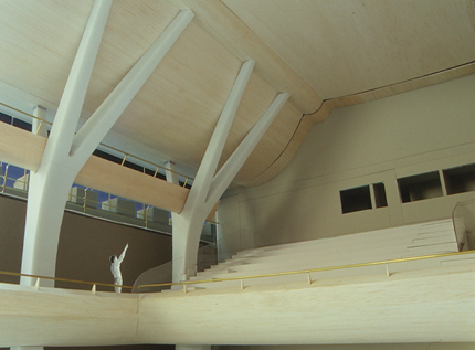 El techo de la sala flota libre sobre la muralla, sin tocarla. Entre ambos se abre una grieta de cristal que permite la entrada de un estrecho rayo de sol durante el día, y durante la noche deja la coronación característica de la muralla a contraluz.